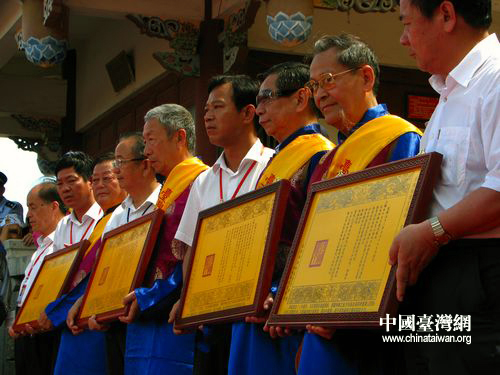 湄洲媽祖祖廟董事會將牌匾授予臺灣148家宮廟代表。(中國臺灣網  馬迪  攝)
