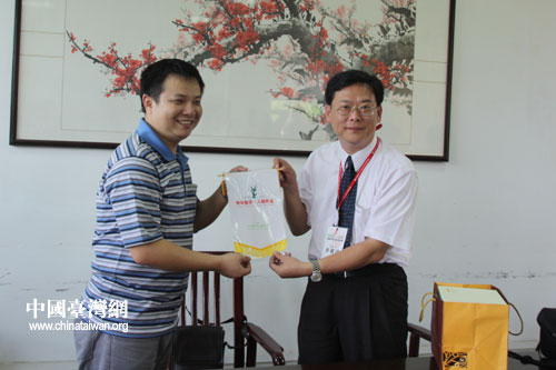 武漢大學(xué)學(xué)生會(huì)負(fù)責(zé)人與臺(tái)灣十大杰出青年基金會(huì)團(tuán)長(zhǎng)彭銘淵互贈(zèng)禮物(中國(guó)臺(tái)灣網(wǎng) 李丹 攝)
