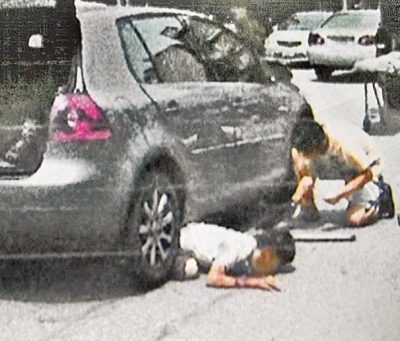 江姓老翁昏倒在馬路中央遭汽車輾過,警方趕抵時,仍卡在車底。圖片來自網絡