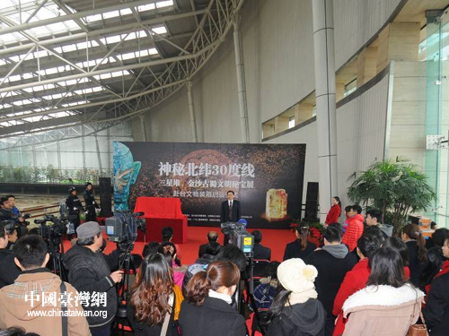 “神秘北緯30°線——三星堆、金沙古蜀文明秘寶展”赴臺(tái)文物裝箱起運(yùn)儀式在成都市金沙遺址博物館舉行。(圖片來(lái)源:四川省臺(tái)辦)