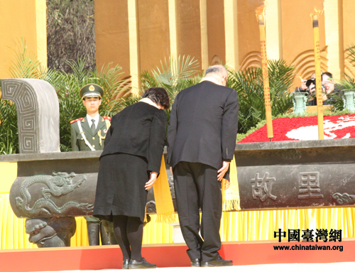 壬辰年黃帝故里拜祖大典于3月24日上午在河南新鄭市隆重舉行,圖為中國國民黨榮譽(yù)主席吳伯雄偕同夫人戴美玉上香禮畢后向黃帝像鞠躬致敬。(中國臺(tái)灣網(wǎng) 王文英 攝)