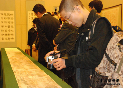 嘉賓們認(rèn)真參觀現(xiàn)藏于臺北故宮博物院的清院本《清明上河圖》。(中國臺灣網(wǎng) 劉瑩 攝)