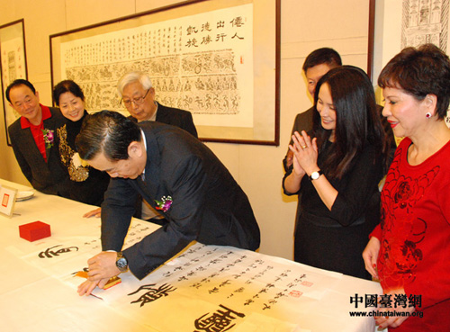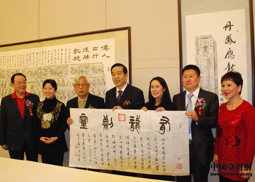 蘇士澍先生將加蓋金印“有龍則靈”的書法作品贈與臺灣代表(中國臺灣網(wǎng) 劉瑩 攝)