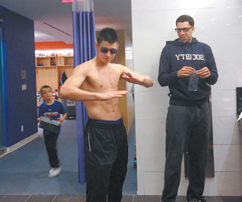 林書豪訓(xùn)練結(jié)束后赤裸上半身,化身“林小龍”與隊(duì)友們打鬧,寄望球隊(duì)今天回到主場后,力阻熱火隊(duì)。