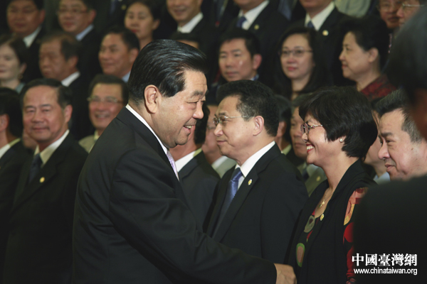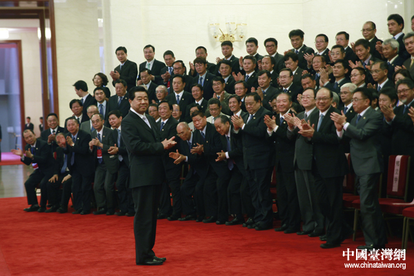 中共中央政治局常委、全國政協主席賈慶林今天下午在人民大會堂會見全國臺企聯第二屆會員代表大會代表并發表重要講話。(中國臺灣網 王偉 攝)