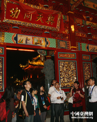 采訪團記者們在參觀臺兒莊古城內的媽祖廟。(中國臺灣網 郭瑩瑩 攝)