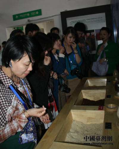 記者們在青島啤酒博物館內(nèi)試吃釀酒所用的各種谷物。(中國臺灣網(wǎng) 郭瑩瑩 攝)