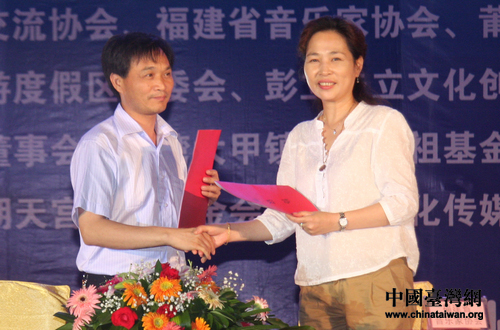 福建省音樂家協會副主席、秘書長唐曉燕與湄洲島管委會主任唐炳椿簽訂聯辦“海峽兩岸(湄洲島)音樂創作基地”協議。(中國臺灣網 郭瑩瑩 攝)