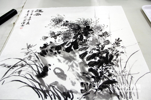 揮毫潑墨臨菊寫意,杰作已成供欣賞。(中國臺灣網 芮益芳 攝)