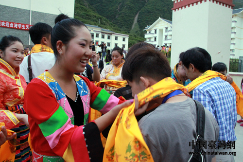 7月5日晚,川臺(tái)兩地學(xué)生在九寨溝縣漳扎小學(xué)舉行篝火晚會(huì)。圖為晚會(huì)開始前,向臺(tái)灣學(xué)生敬獻(xiàn)哈達(dá)。(中國臺(tái)灣網(wǎng) 王偉 攝)