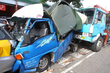中國臺灣網7月11日消息 據臺灣媒體報道,今天上午7點15分,正處上班高峰期,臺中市1輛大貨車駕駛賴某載運大型電器設備,行經臺中市自由路與復興路口處疑剎車失靈不慎追撞2輛小貨車后,失控沖撞路邊停車,把7輛車推擠成一團。事故原因警方正在調查中。(中國臺灣網 焦源源)