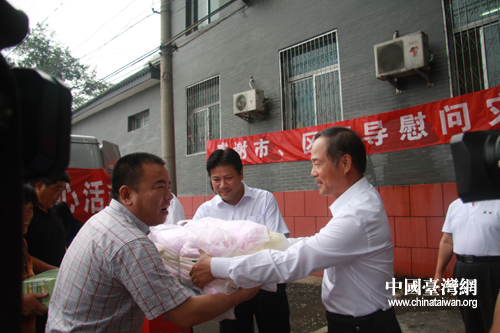 25日下午,北京市臺辦和北京臺資企業協會負責人來到深受水災困擾的重災區房山區河北鎮,向暴雨受災群眾捐贈了1000條毛巾被、1000箱礦泉水和1000箱方便面等一批急救物資。(中國臺灣網 高斯斯 攝 )