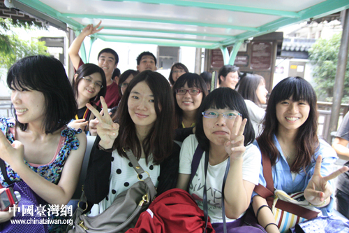 到達景區后,乘坐觀光車前往同里古鎮,個個都按捺不住激動的心情。(中國臺灣網 孟雅詩 攝)