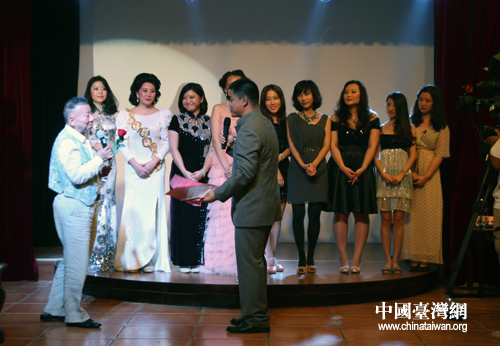 鄧麗君的老師、來(lái)自臺(tái)灣的著名音樂(lè)制作人左宏元先生為自己心儀的模仿者獻(xiàn)上玫瑰。(中國(guó)臺(tái)灣網(wǎng) 王怡然 攝)