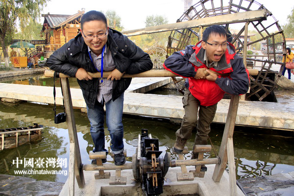10月22日,“感知甘肅”第四屆全國網(wǎng)絡(luò)媒體行活動在蘭州進行,圖為采訪團記者體驗傳統(tǒng)水車。(中國臺灣網(wǎng) 董憲超 攝)