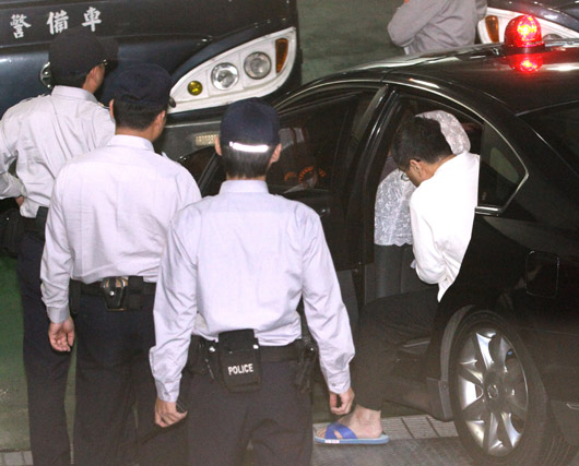 前臺當局“行政院秘書長”林益世(右)昨天遭臺特偵組依貪污罪起訴,并在警方的戒護下移審臺北地院開接押庭,林益世下車時刻意避開媒體鏡頭,以螃蟹橫行的方式進入地院開庭。 圖片來源:臺灣聯合新聞網