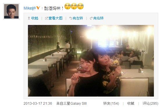 小S的老公Mike在微博放上她的照片,開玩笑虧她是“酗酒媽咪”。(圖片來自臺(tái)媒)