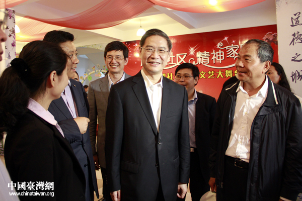 17日下午,在昆山調研察的中臺辦、國臺辦主任張志軍走進普通居民區,探望在此居住臺胞的生活情況,圖為張志軍在社區工作人員陪同下參觀居民活動室。(中國臺灣網 楊麗 攝)