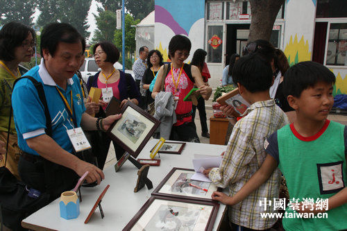 臺灣參訪團成員在欣賞孩子們的畫作。(中國臺灣網 郭瑩瑩 攝)