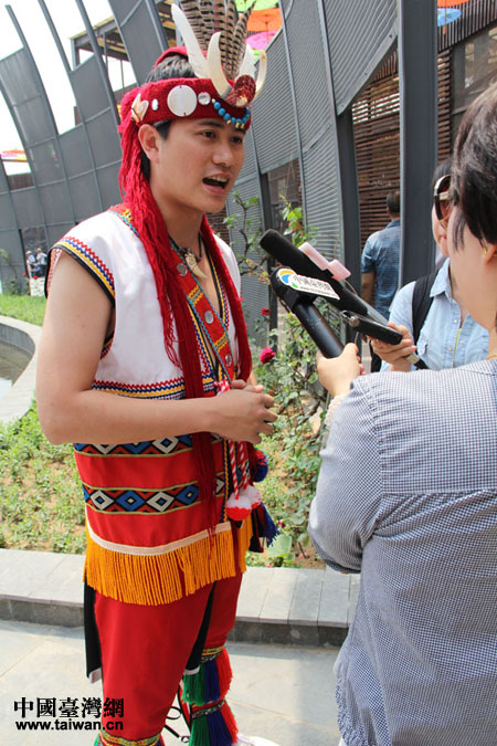 園博臺灣園里,阿美族小伙對記者唱起了民族歌曲。(中國臺灣網 黃艷艷 攝)