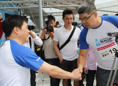 臺(tái)北101大樓國(guó)際登高賽5日舉行,臺(tái)北市經(jīng)發(fā)會(huì)副召集人連勝文(右)擔(dān)任臺(tái)北市府第19棒,并交棒給臺(tái)北市長(zhǎng)郝龍斌(左)。圖為賽后2人握手致意。(圖片來(lái)自臺(tái)媒)