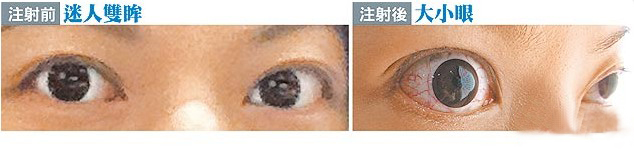 吳太太說,做完療程后她遵從醫師囑咐,4小時內不敢躺下、碰臉,之后洗臉也特別注意不按壓施打處,不料3天后左眼眼皮逐漸下垂,一周后雙眼變成大小眼,臉部肌肉完全放松時,左眼皮下垂到像整片蓋下,若用力撐開雙眼,右眼又睜大得像在瞪人,看起來很怪異,她嚇得趕緊回診求救,醫師幫她補打一針肉毒桿菌并提供舒緩藥劑眼藥水,但狀況并未改善。