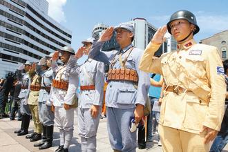 臺灣新黨青年委員會昨天至中山堂抗戰勝利紀念碑前獻花致敬,現場有一群認同抗戰歷史的青年著當年抗戰軍服前來,希望喚起島內民眾與當局對抗戰歷史的重視。圖片來源:臺灣《聯合報》