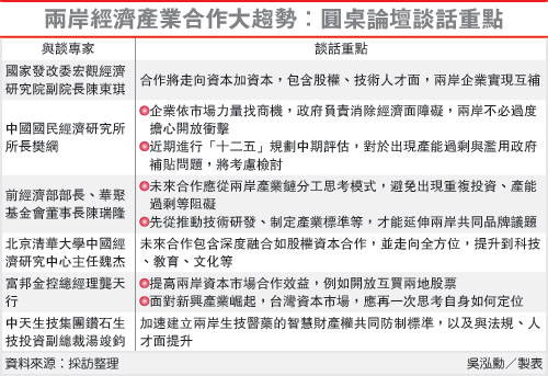 兩岸經(jīng)濟(jì)產(chǎn)業(yè)合作大趨勢(shì):圓桌論壇談話重點(diǎn)。圖片來源:臺(tái)灣《聯(lián)合報(bào)》