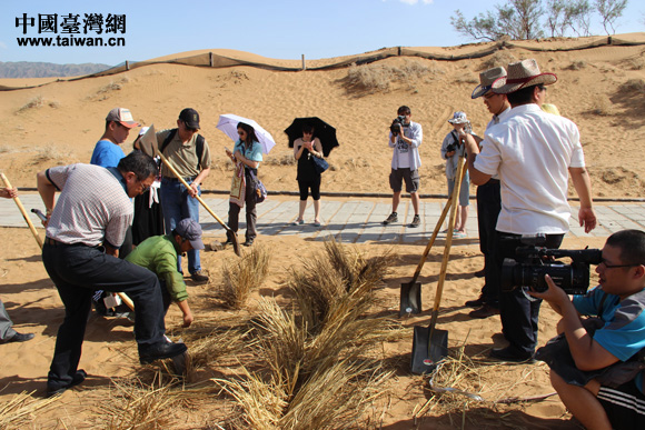 兩岸記者團團長楊毅親自制作茅草方格(中國臺灣網 王文英 攝)