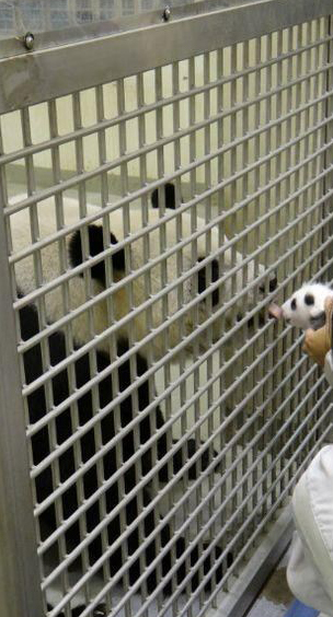 “圓仔”當日飽飽的吃完早餐,休息片刻后,保育員小心翼翼將它帶出保溫箱,與媽媽面對面。為讓“圓仔”與“圓圓”更近距離地接觸,于是將它抱起靠近格網(wǎng)邊與“圓圓”面對面。