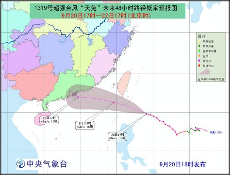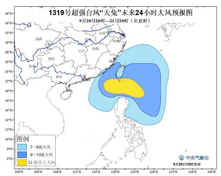 中央氣象臺網站臺風橙色預警指出,“天兔”將以每小時20公里左右的速度向西偏北方向移動,強度變化不大或略有減弱,21日中午前后穿過巴士海峽后,進入南海東北部海面,然后逐漸向廣東沿海靠近。