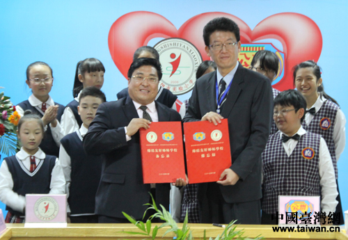 10月26日,河南省沁陽市實驗小學校長張立強與臺灣曹公小學校長彭連煥分別代表兩校共同簽署締結友好姊妹學校備忘錄。(中國臺灣網 扶海濤 攝)
