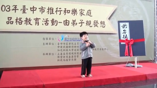 臺中市社會局、臺中市宏孝院玉霄清虛全真協會、財團法人上善長青環境保護基金會等民間團體,舉辦弟子規背誦競賽活動,將于12月1日開始報名,并于明年2月開始比賽,冠軍的參賽者將可獲得新臺幣20萬元新臺幣獎金。