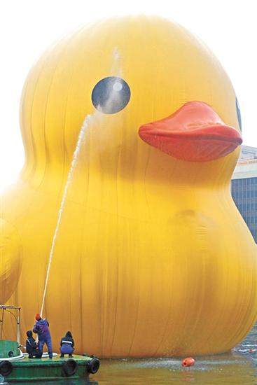 中國(guó)臺(tái)灣網(wǎng)12月26日消息 據(jù)臺(tái)灣《中國(guó)時(shí)報(bào)》報(bào)道,大黃鴨到基隆港展出后,被灰塵污垢熏得“黑鴨鴨”,昨(25)日主辦單位委由臺(tái)船及清潔公司執(zhí)行全球第一次大黃鴨洗澡濕背秀,但強(qiáng)力水柱加上軟刷伺候,污垢仍不為所動(dòng),黑黑臟臟的痕跡甚至更加擴(kuò)散。有網(wǎng)友還笑說(shuō)小鴨長(zhǎng)胸毛變身“龐德鴨”,再繼續(xù)黑下去,就要變姜母鴨了。