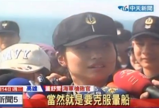 中國臺灣網1月14日消息 據臺灣“東森新聞”報道,臺灣防務部門春節巡弋14日邀請媒體前往海軍左營基地考察戰力,除反快艇作戰及海上戰術運動,還有錦江級艦模擬施放深水炸彈攻擊;臺媒所搭的拉法葉級迪化艦上,女槍炮官董舒雯少尉因為亮眼外型成為鎂光燈焦點,風頭甚至蓋過臺軍表演。(點擊查看更多臺軍正妹)