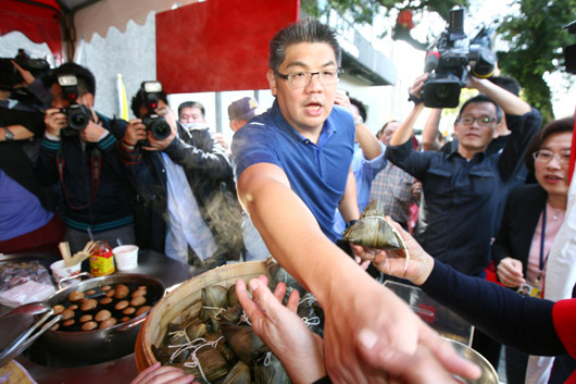 連勝文上午到木柵指南宮參拜,一路上與民眾握手致意。來源:臺灣《聯合報》