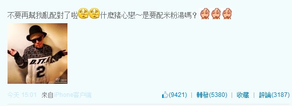 小豬則是在微博上貼出一張無奈的照片并說,“不要再幫我亂配對了啦!什么豬心戀,是要配米粉嗎?”