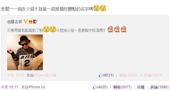 林心如也轉貼小豬的貼文,并回應說,“老板,一碗多少錢?”“話說~能換個好聽點的名字嗎?”,搞笑看待緋聞。(中國臺灣網 何建峰)