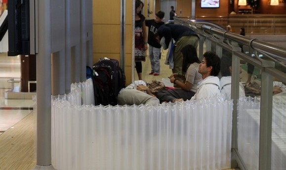 成田機(jī)場因大雪造成航班大亂,旅客利用氣墊充當(dāng)隔板入眠。(臺媒圖)