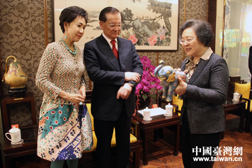 林文漪向連戰(zhàn)夫婦贈送景泰藍(lán)“萬象更新”。(中國臺灣網(wǎng) 王怡然 攝)