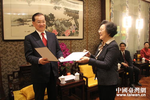 林文漪向連戰夫人連方瑀贈送禮物。(中國臺灣網 王怡然 攝)