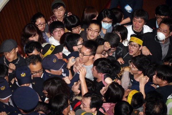 為表達對國民黨“召委”張慶忠17日在“內政委員會”中,宣布將《兩岸服貿協議》直接送臺“立法院院會”存查的不滿情緒,昨晚在臺“立法院”外“守護臺灣民主之夜”的抗議學生和民眾,晚間9點多沖破“立院”大門,上百位學生更進一步直奔議場占據主席臺。直至凌晨1點左右,臺“立法院”外、濟南路上已經陸續聚集1000多人,仍有民眾從面對群賢樓右側的入口傳送物資,或著進入議場。