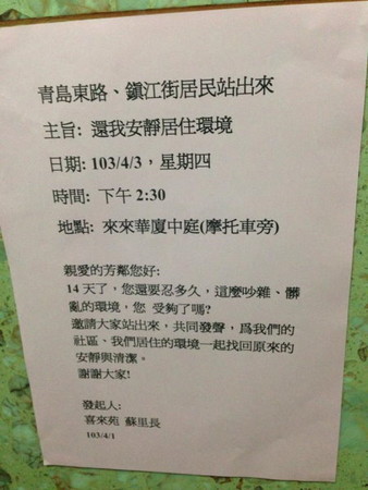當(dāng)?shù)氐睦镩L在許多小區(qū)內(nèi)張貼告示“青島東路、鎮(zhèn)江街居民站出來”,希望在4月3日下午2點(diǎn)30分,到青島東路上來來華廈的中庭聚會,要求大家一起發(fā)聲,不要再忍受吵雜、臟亂的環(huán)境,希望還給居民安靜與清潔的生活空間。(中國臺灣網(wǎng) 高旭)