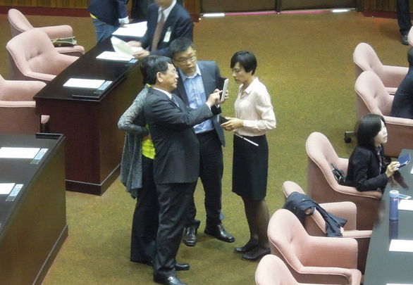 民進(jìn)黨“立委”陳明文、蔡其昌等人圍在一起看手機(jī)。(臺媒圖)