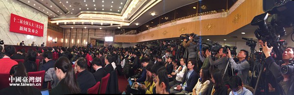 第十二屆全國人大第三次會議4日舉行首場新聞發布會,圖為新聞發布會現場長槍短炮,座無虛席。(中國臺灣網 高斯斯 攝)