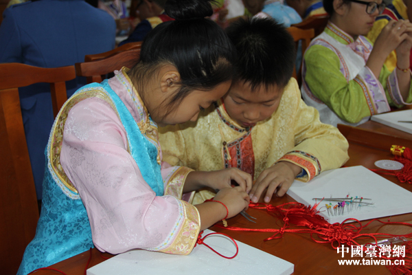 滿族學(xué)堂里孩子們正認(rèn)真地學(xué)習(xí)編織中國結(jié)(中國臺灣網(wǎng) 楊永青 攝)