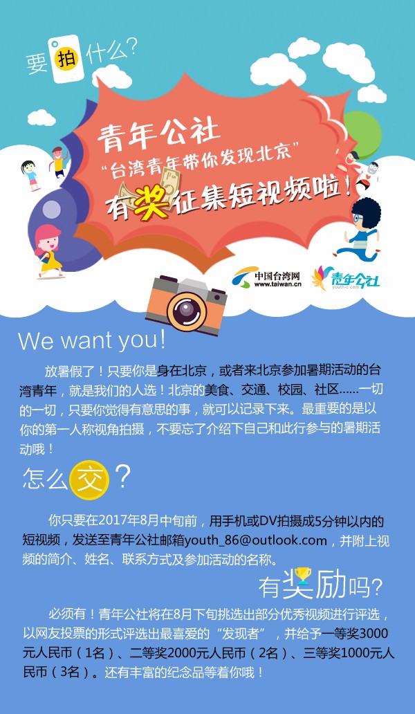 青年公社現(xiàn)正式開啟“臺灣青年帶你發(fā)現(xiàn)北京”短視頻征集活動,這個暑假,用你的視角發(fā)現(xiàn)北京,贏千元獎金!