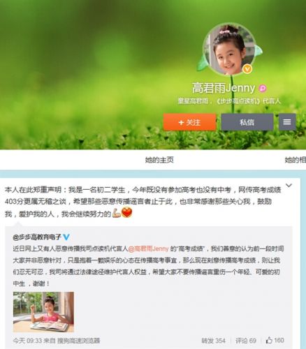 “點讀機”女孩的本尊高君雨今天下午通過個人微博回應稱,網上有關考試失利的消息都是假的,自己目前仍是一名初二的學生,沒有參加中考、更沒有參加高考,請大家不要聽信謠言。