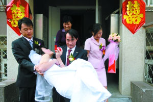 昨日,新郎劉存貴準(zhǔn)備抱新娘王丹去酒店舉行結(jié)婚宴會。 記者 王嘉寧 攝