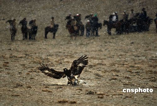 記者在獵鷹狩獵場看到,當?shù)孛嫔嫌蝎C物野兔或者狐貍出現(xiàn)的時候,這些被馴養(yǎng)的獵鷹頭部的羽毛會立刻“怒發(fā)沖冠”,張開健碩的翅膀從馴鷹人的肩膀上或者手上飛向天空,盤旋著,尋找最佳的捕獵機會。當一只狐貍或者野兔出現(xiàn)在它的視線中,獵鷹便加快盤旋的速度,尋找到機會后,便用近九十度的直角向下迅猛俯沖,兩只如同鋼構一般的鷹爪死死的摁住獵物,等待它的主人前去捕獲獵物。